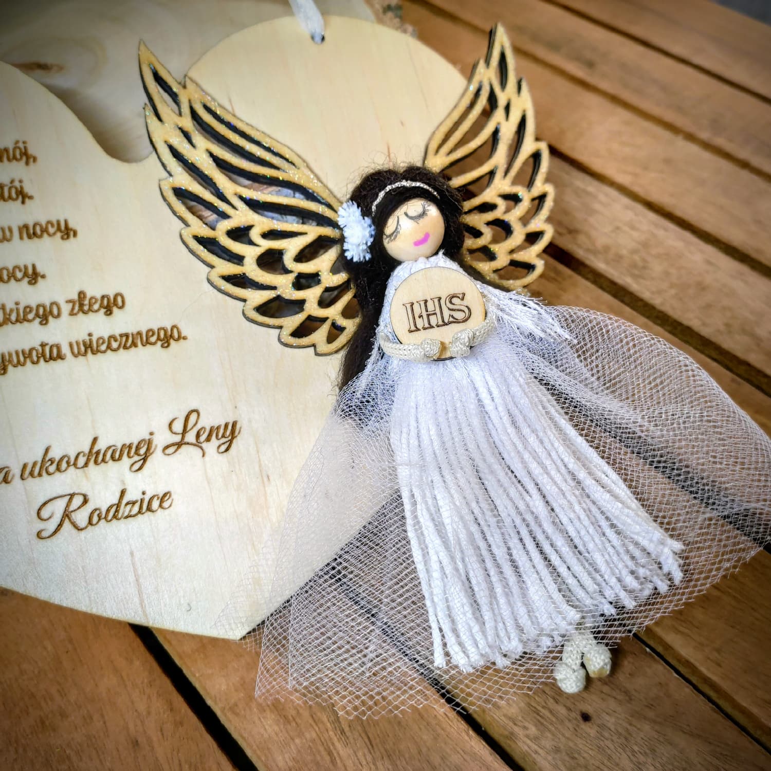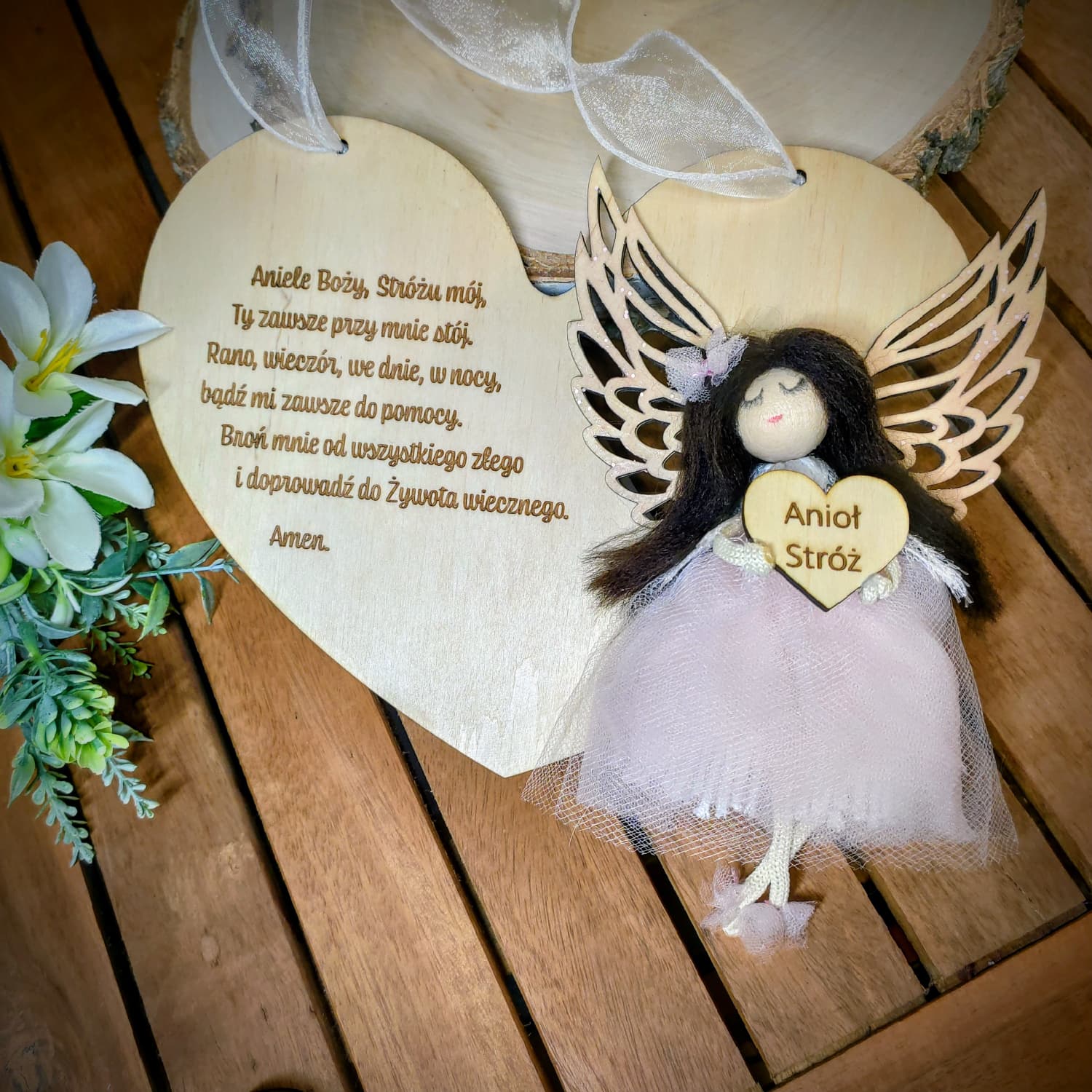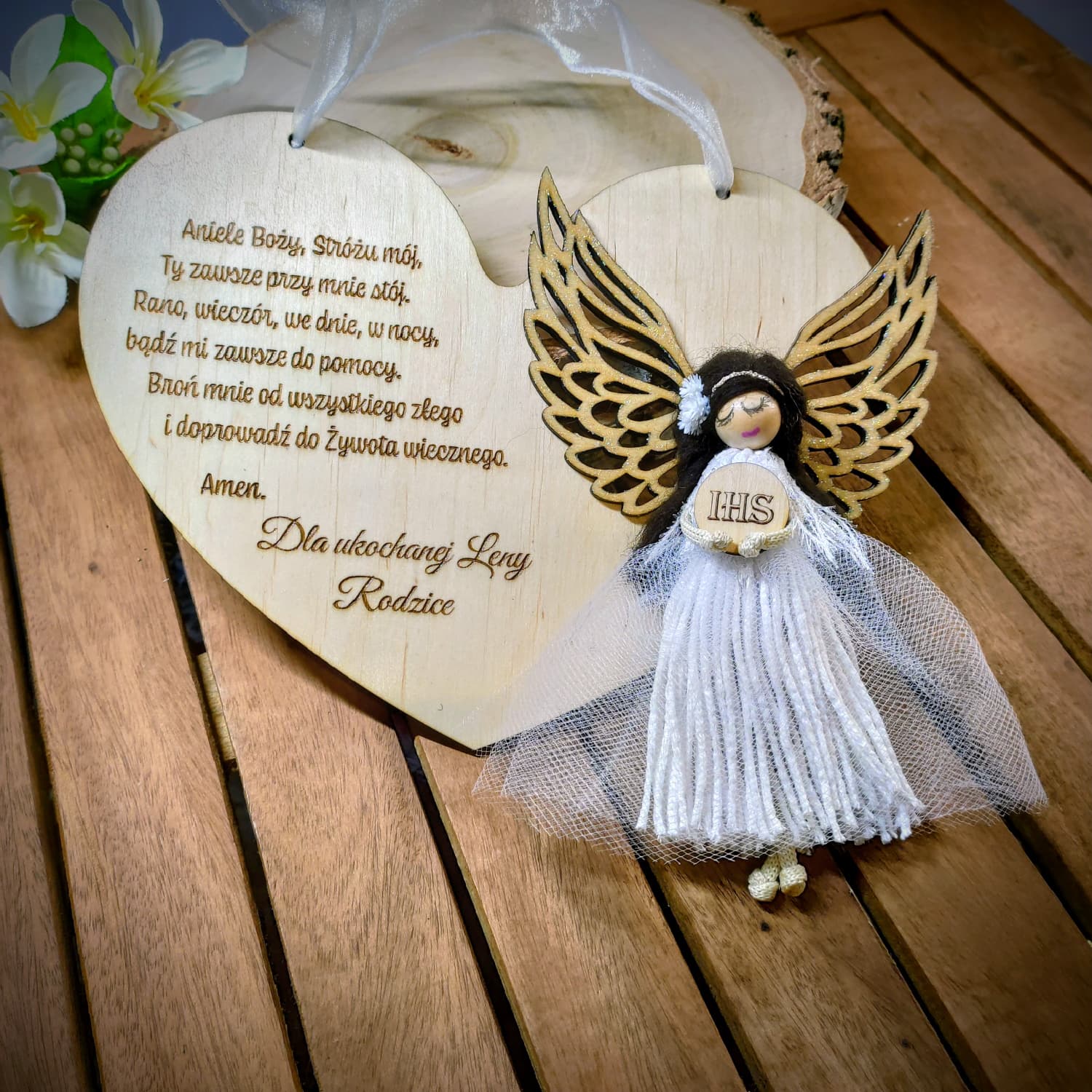 Serduszko ozdobione jest starannie wykonanym grawerem modlitwy do Anioła Stróża oraz indywidualną dedykacją, dzięki czemu staje się niepowtarzalną pamiątką na lata. Uroczy aniołek z delikatnymi skrzydłami i tiulową sukienką dodaje całości lekkości i wyjątkowego uroku.
