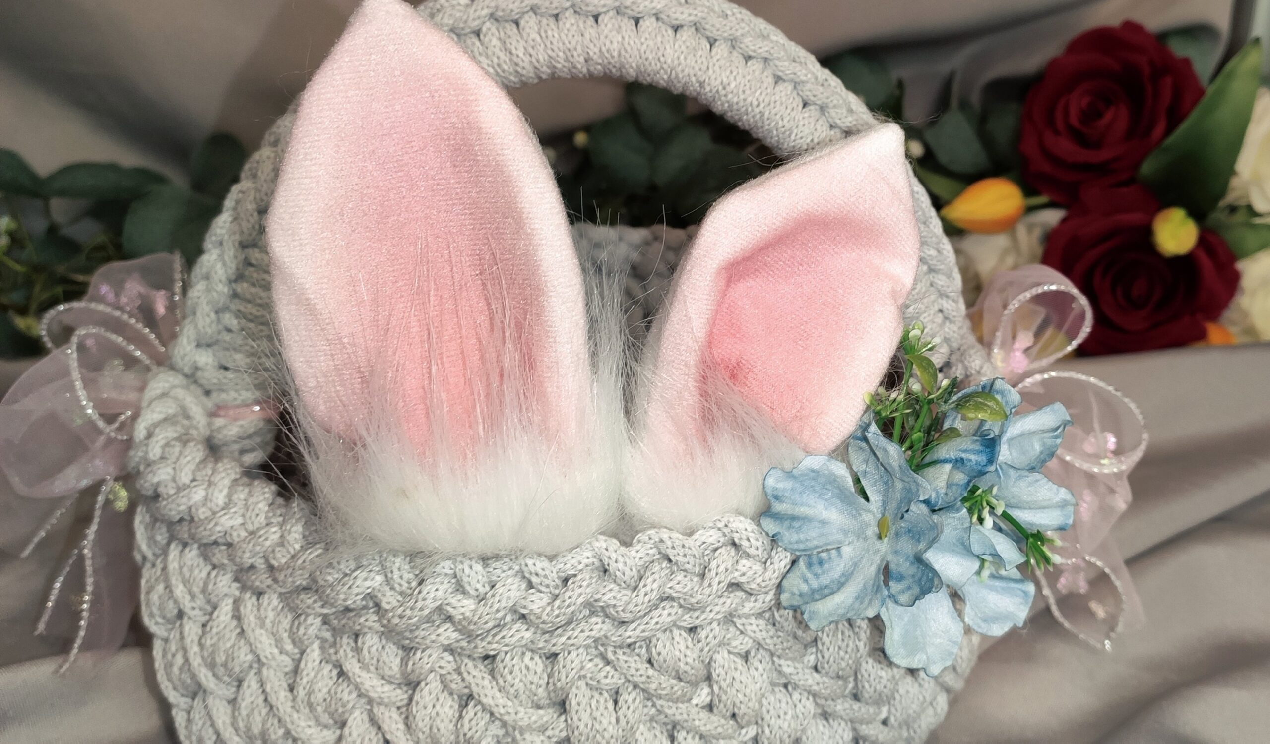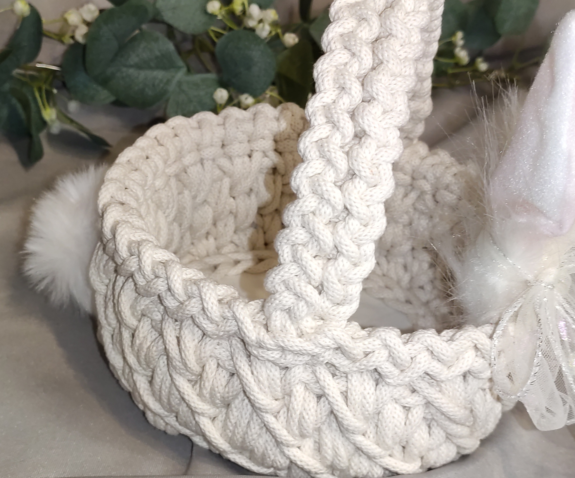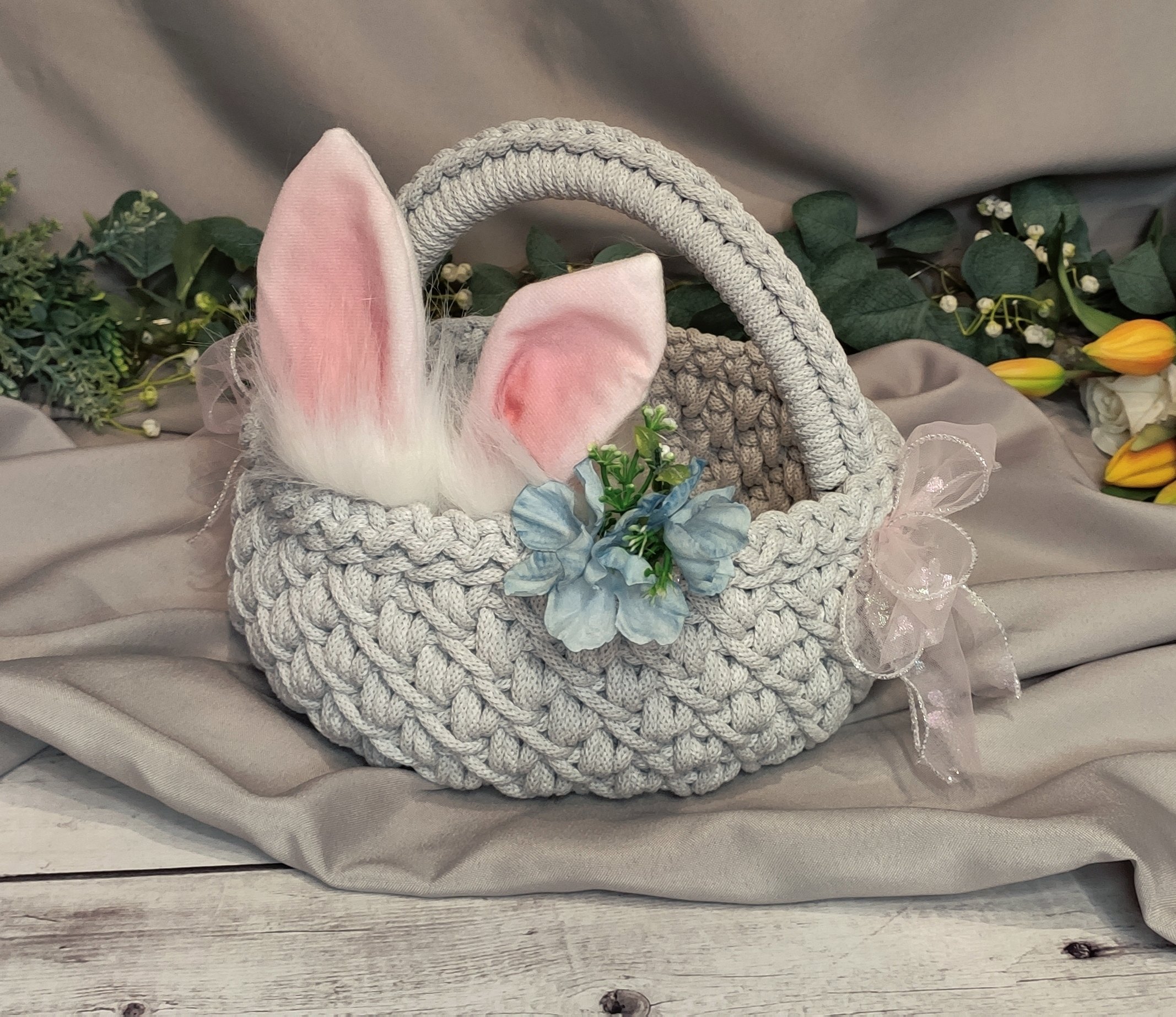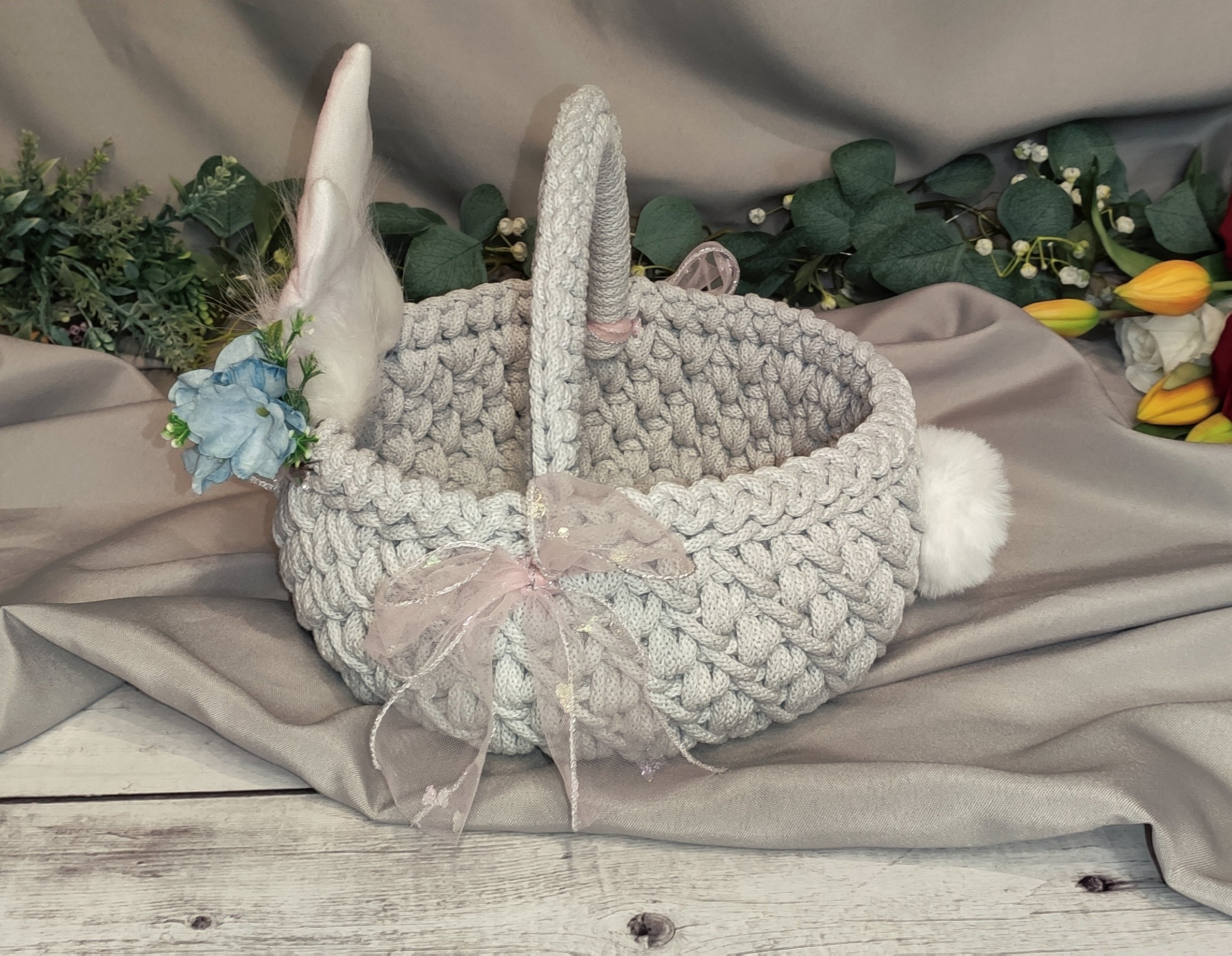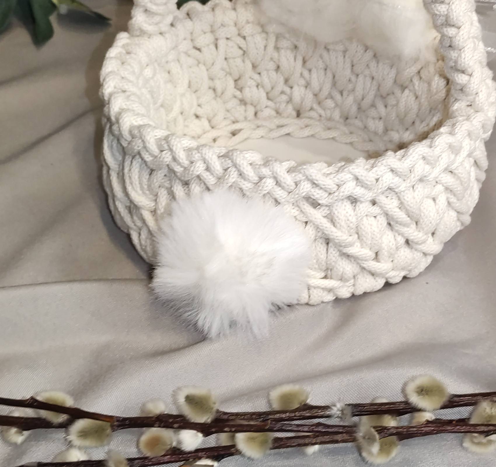 Dekoracyjne uszka i miękki pompon nadają mu wyjątkowego, dziecięcego charakteru. To idealny koszyczek na święconkę, jajka, słodkości lub drobne upominki od Zajączka.