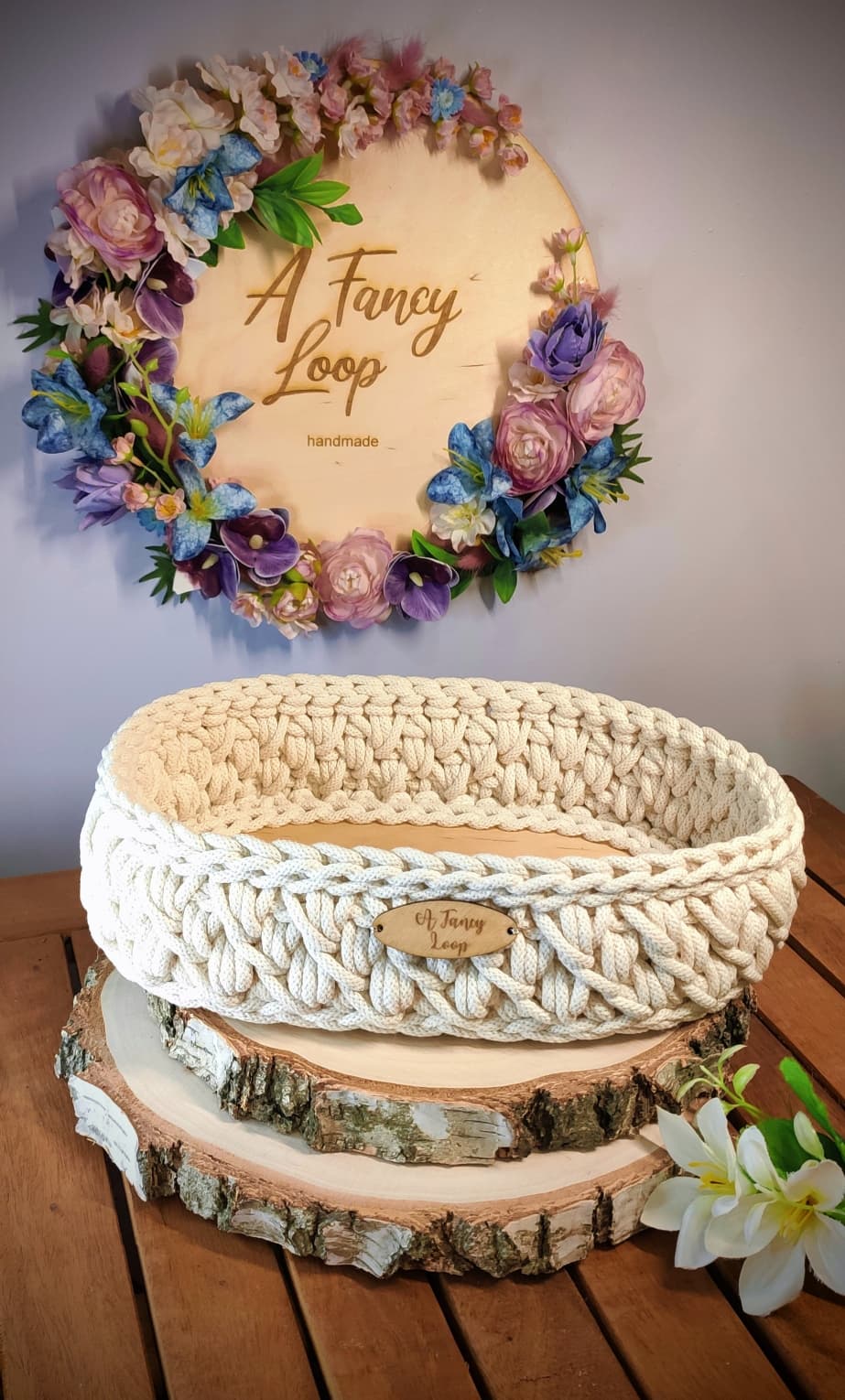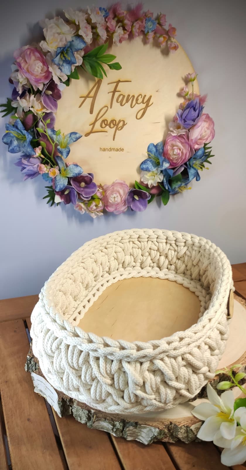 Koszyk został wykonany ręcznie techniką szydełkową z wysokiej jakości sznurka bawełnianego i osadzony na stabilnej, drewnianej bazie. To gotowy egzemplarz dostępny od ręki – idealny również jako stylowy prezent.