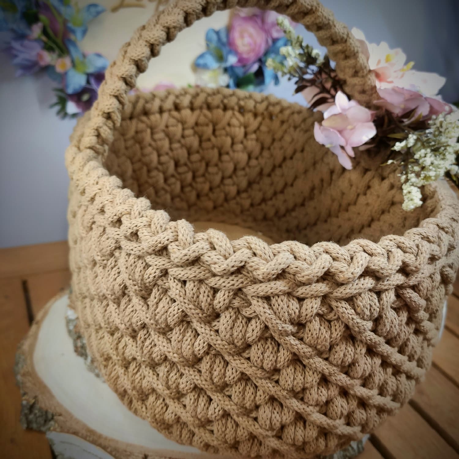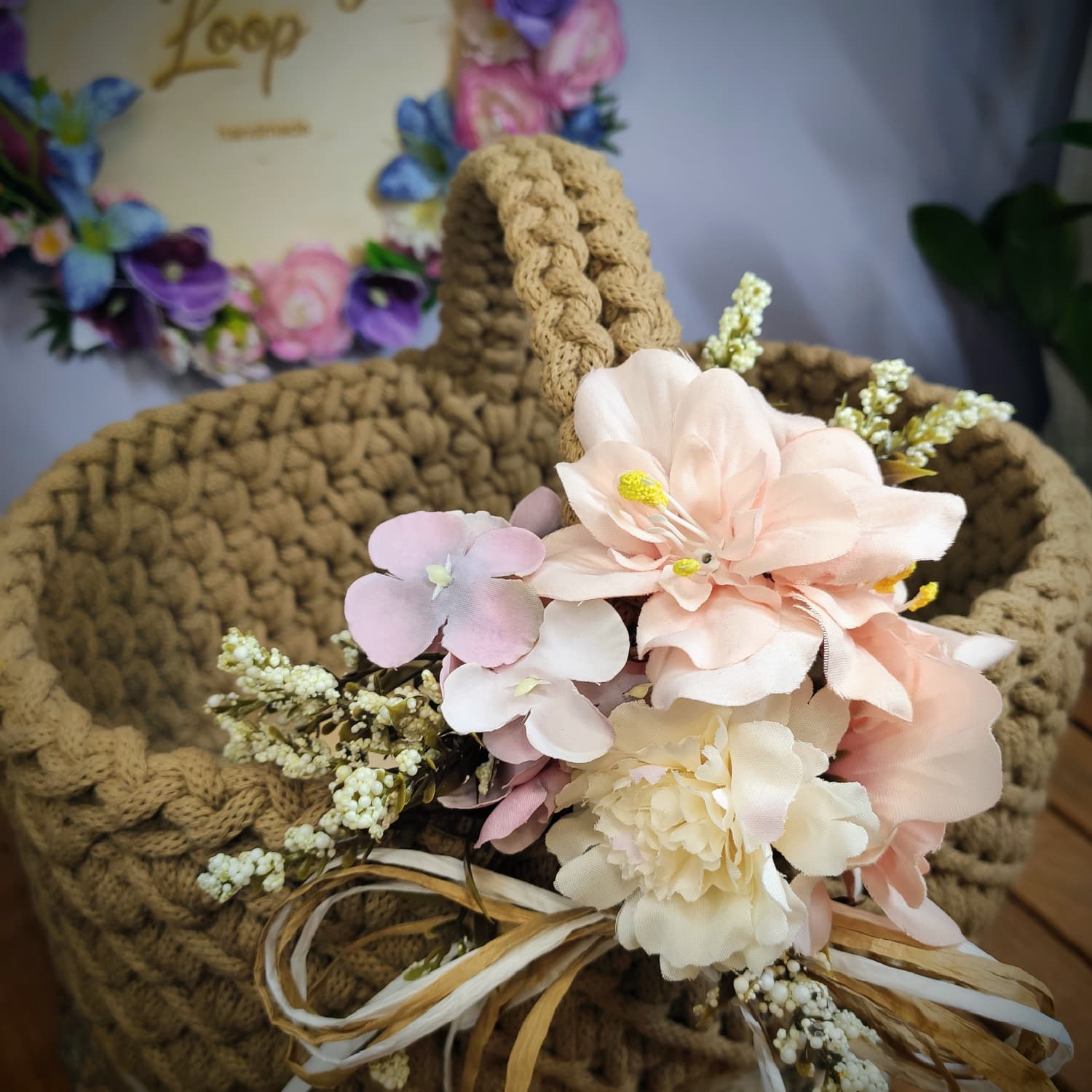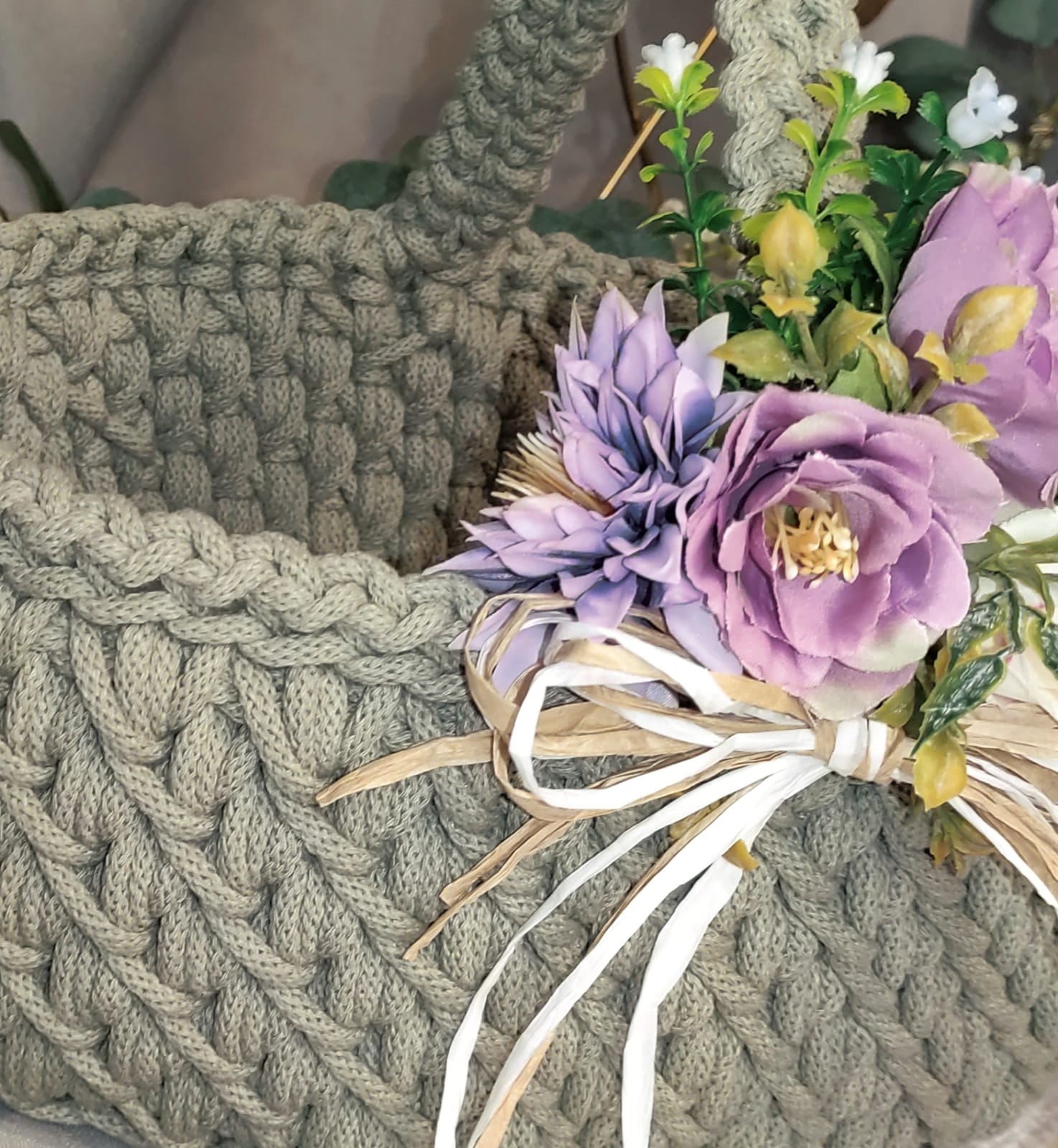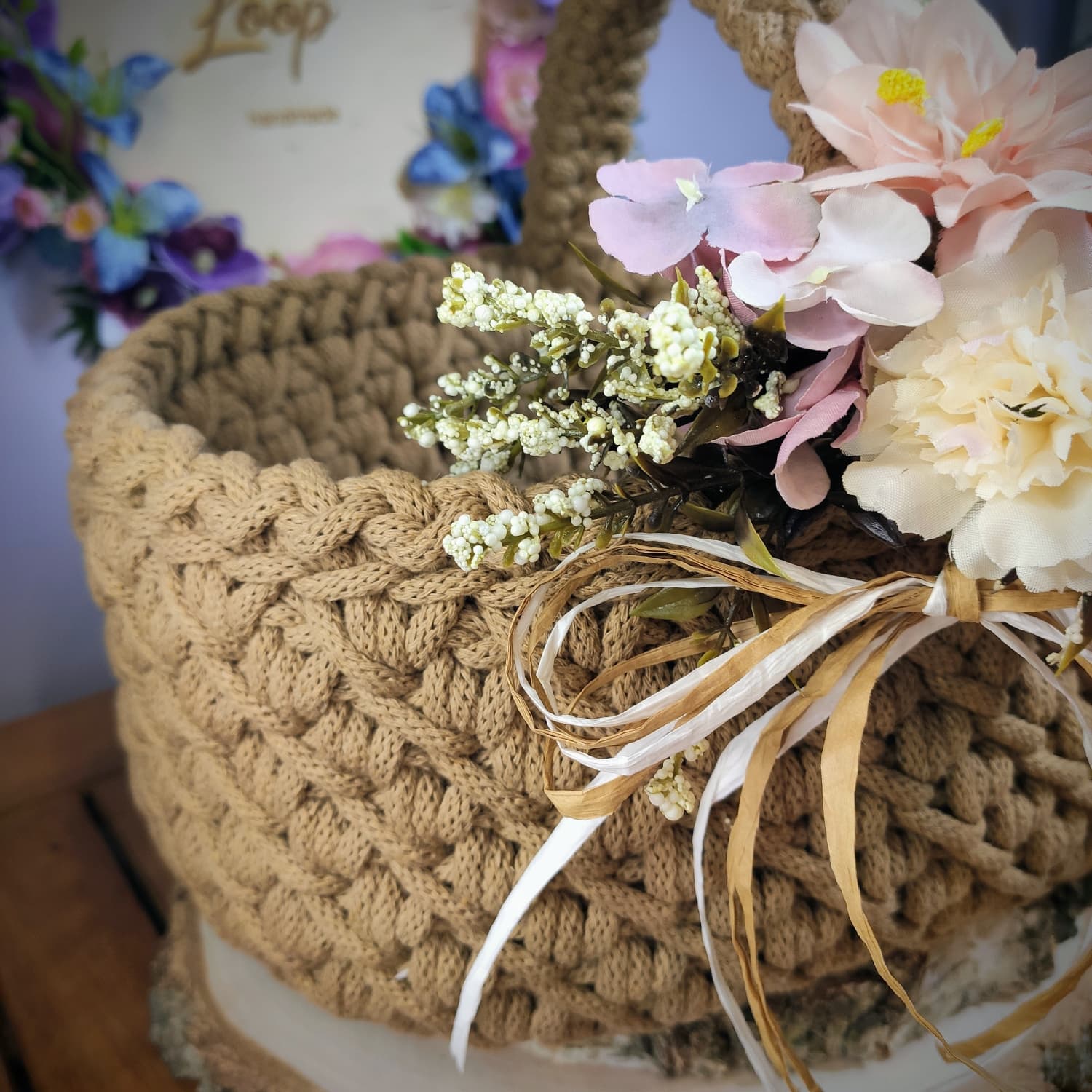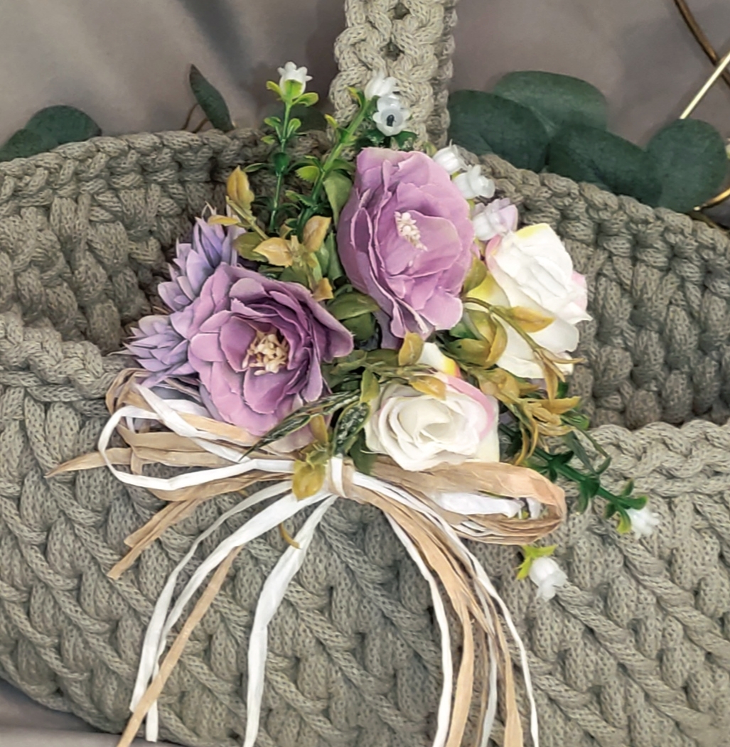 Koszyczek zdobi dekoracyjna kompozycja kwiatowa dopasowana kolorystycznie do wybranego odcienia sznurka, co tworzy spójny i estetyczny zestaw wielkanocny.