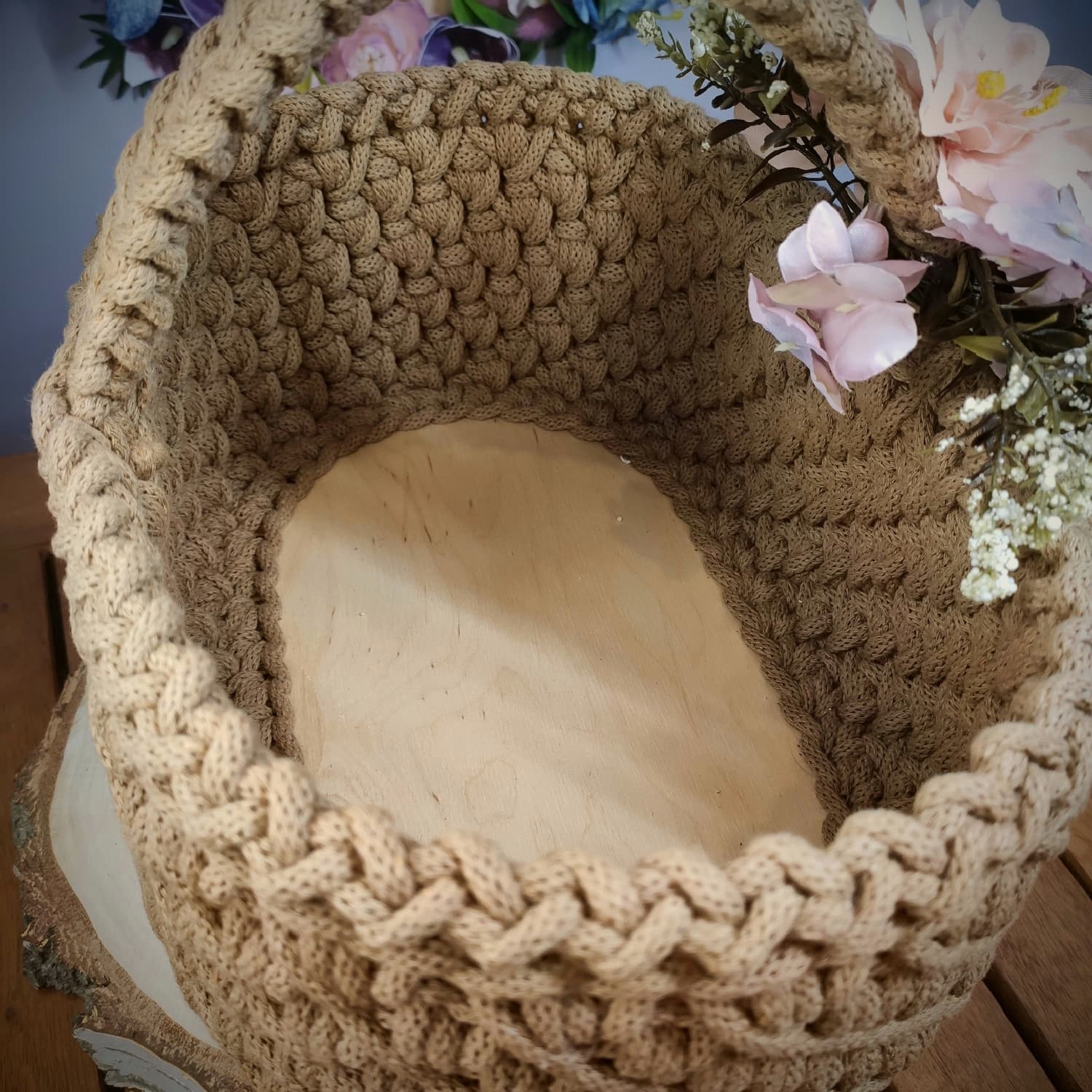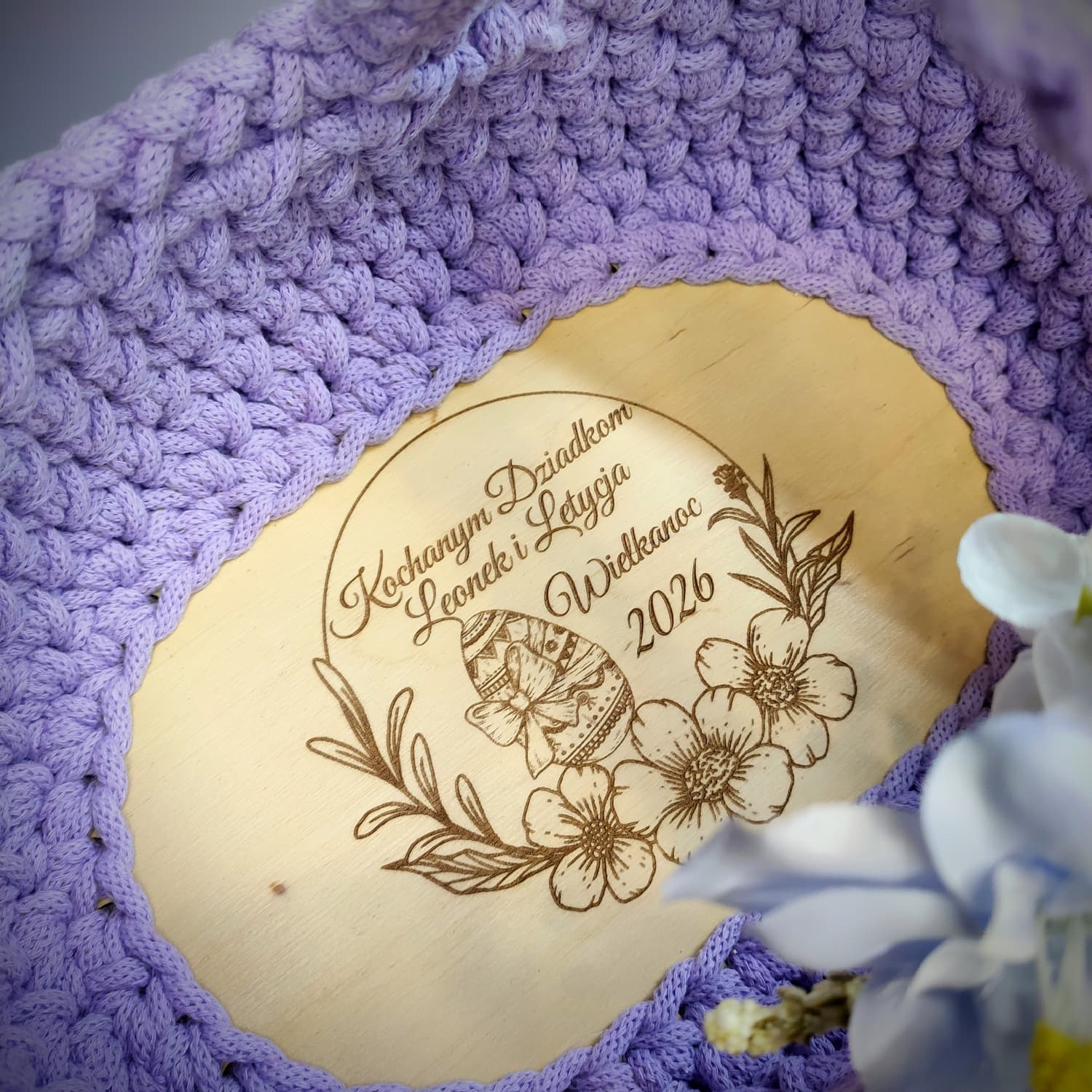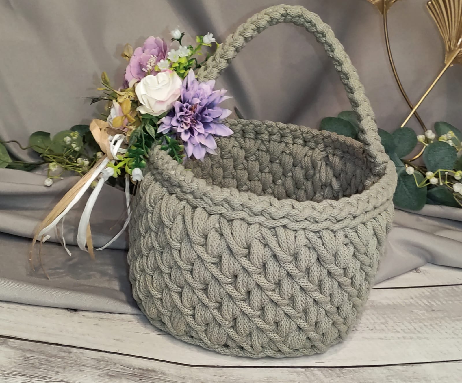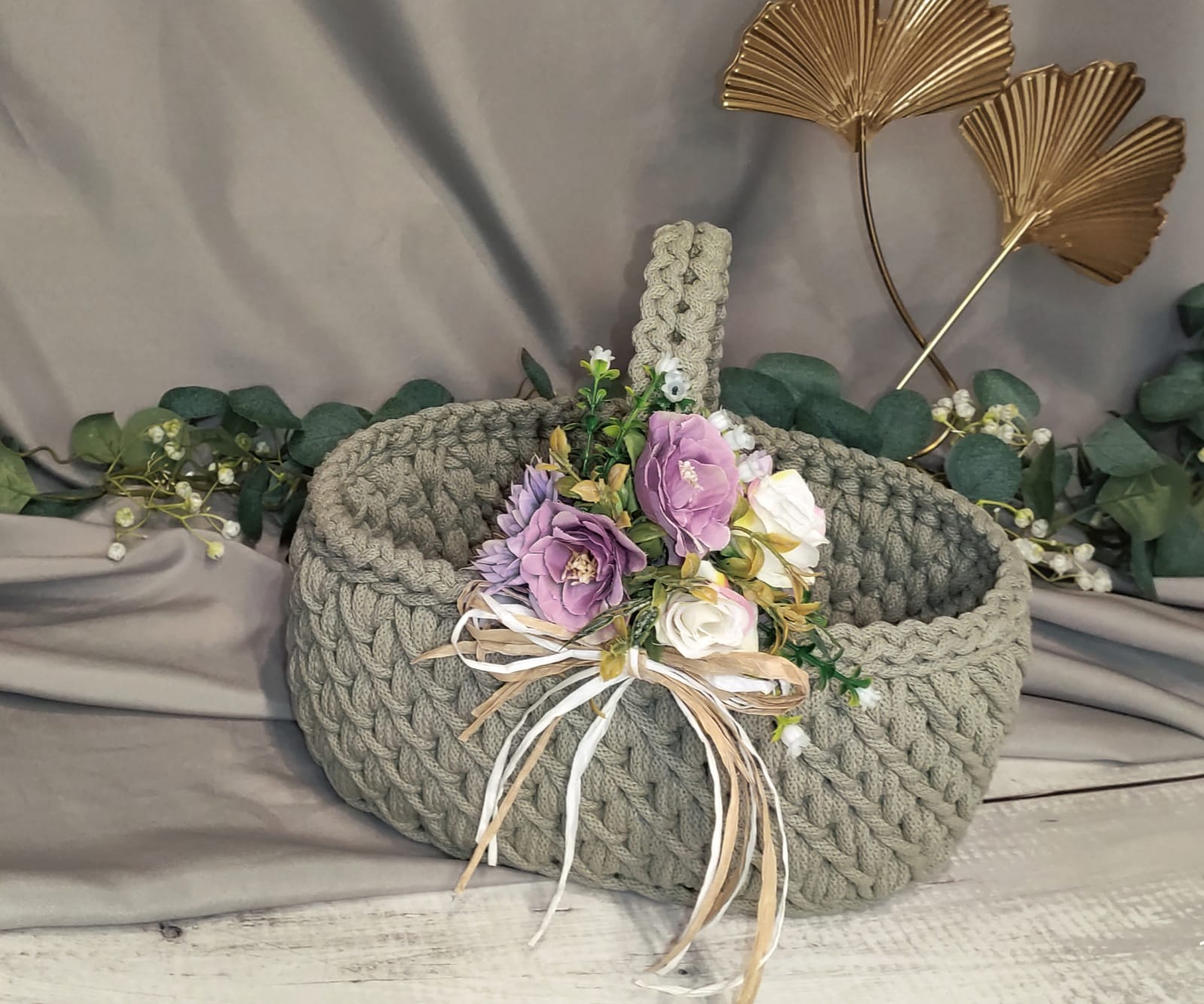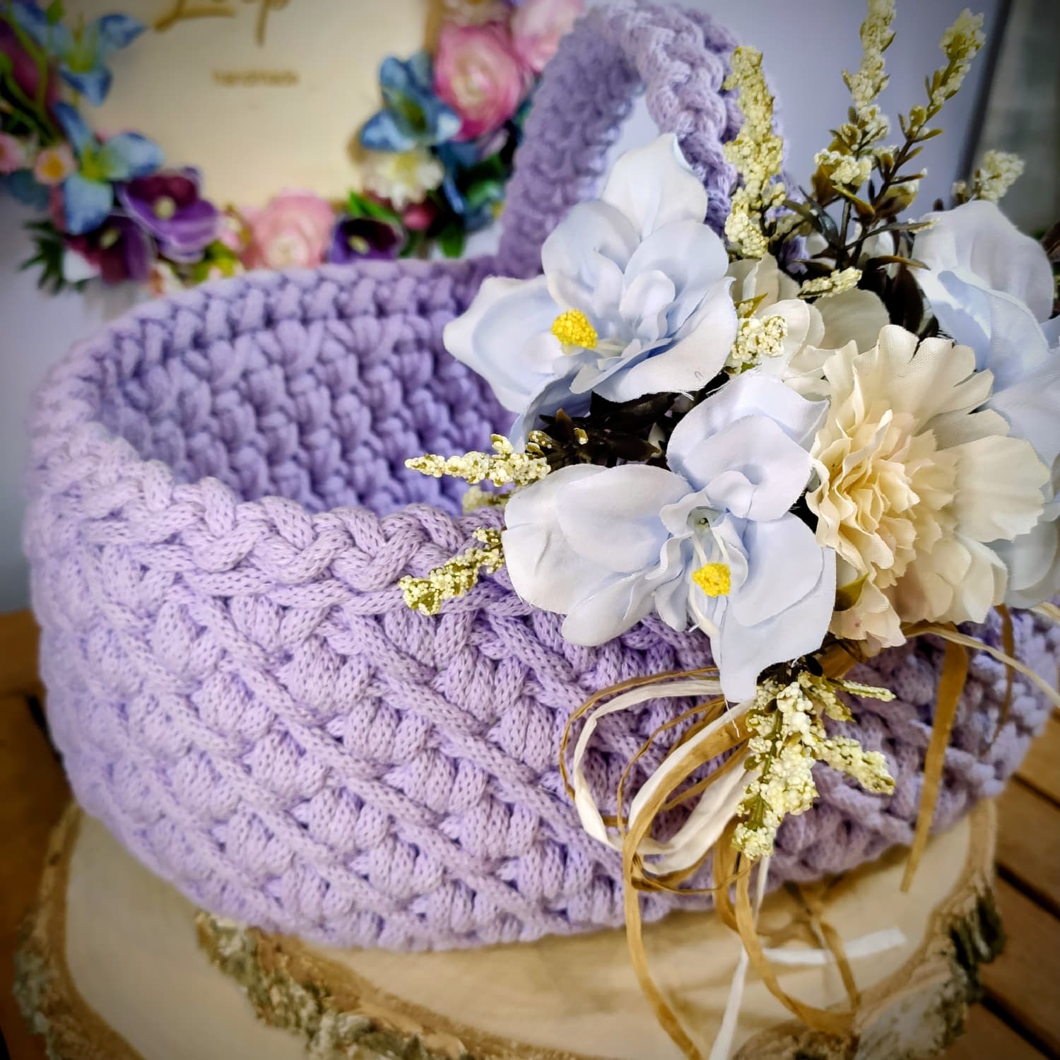Koszyczek zdobi dekoracyjna kompozycja kwiatowa dopasowana kolorystycznie do wybranego odcienia sznurka, co tworzy spójny i estetyczny zestaw wielkanocny.