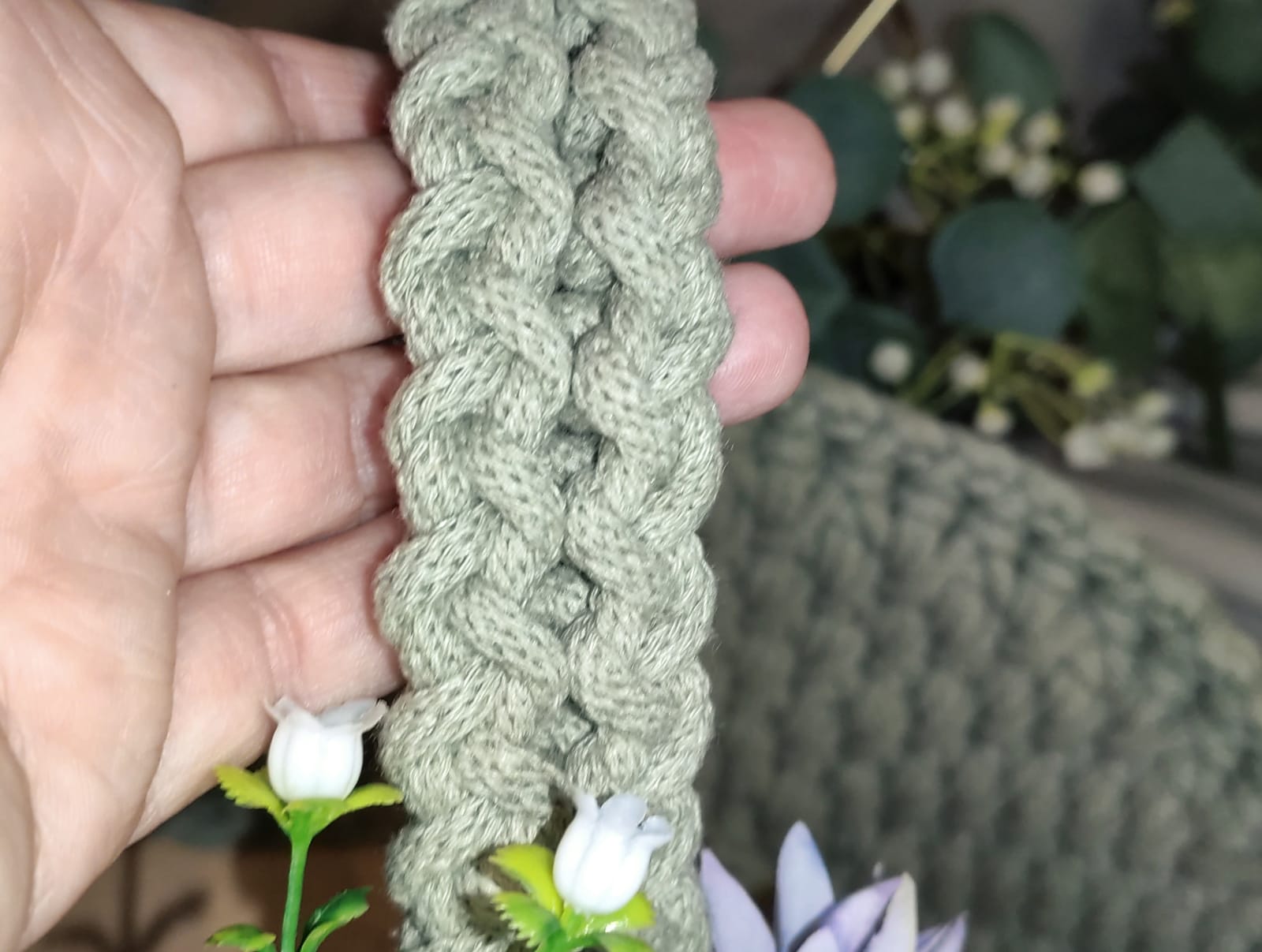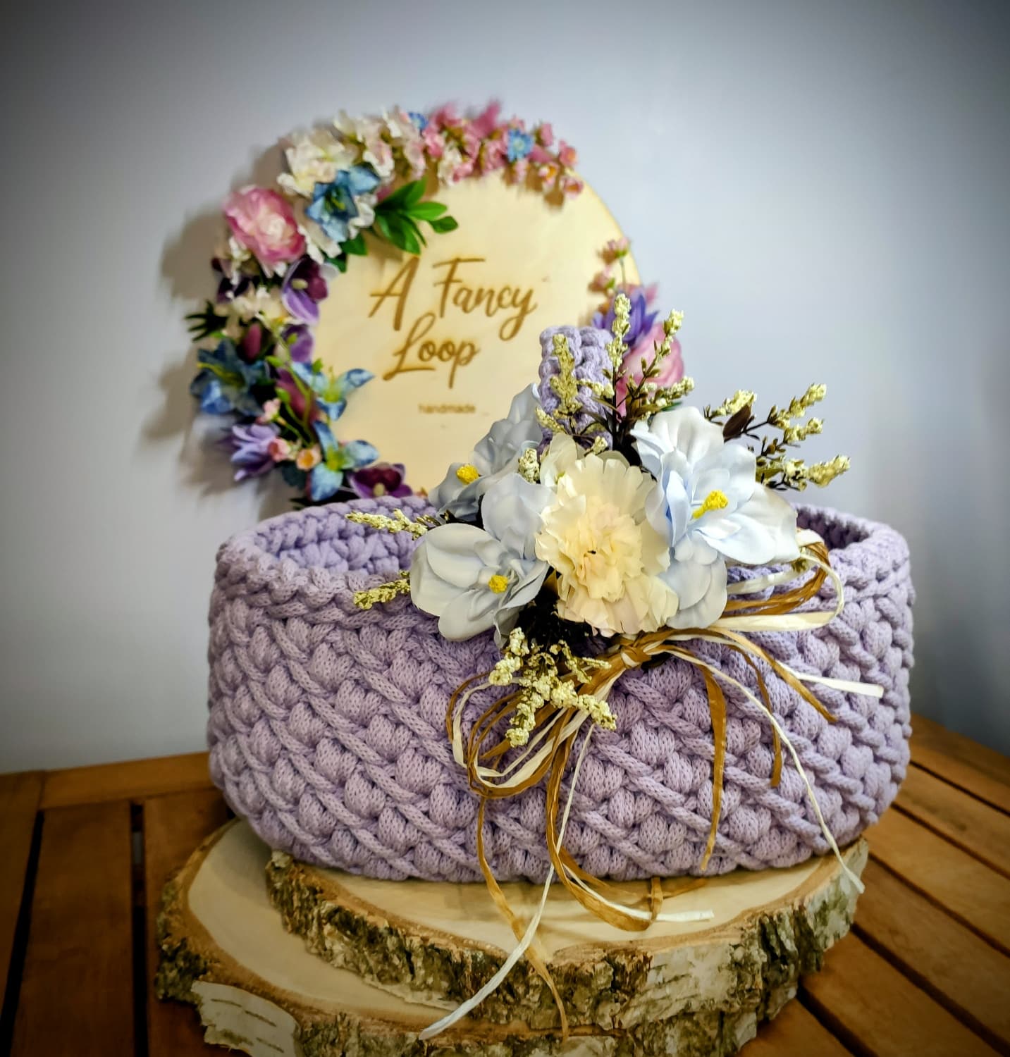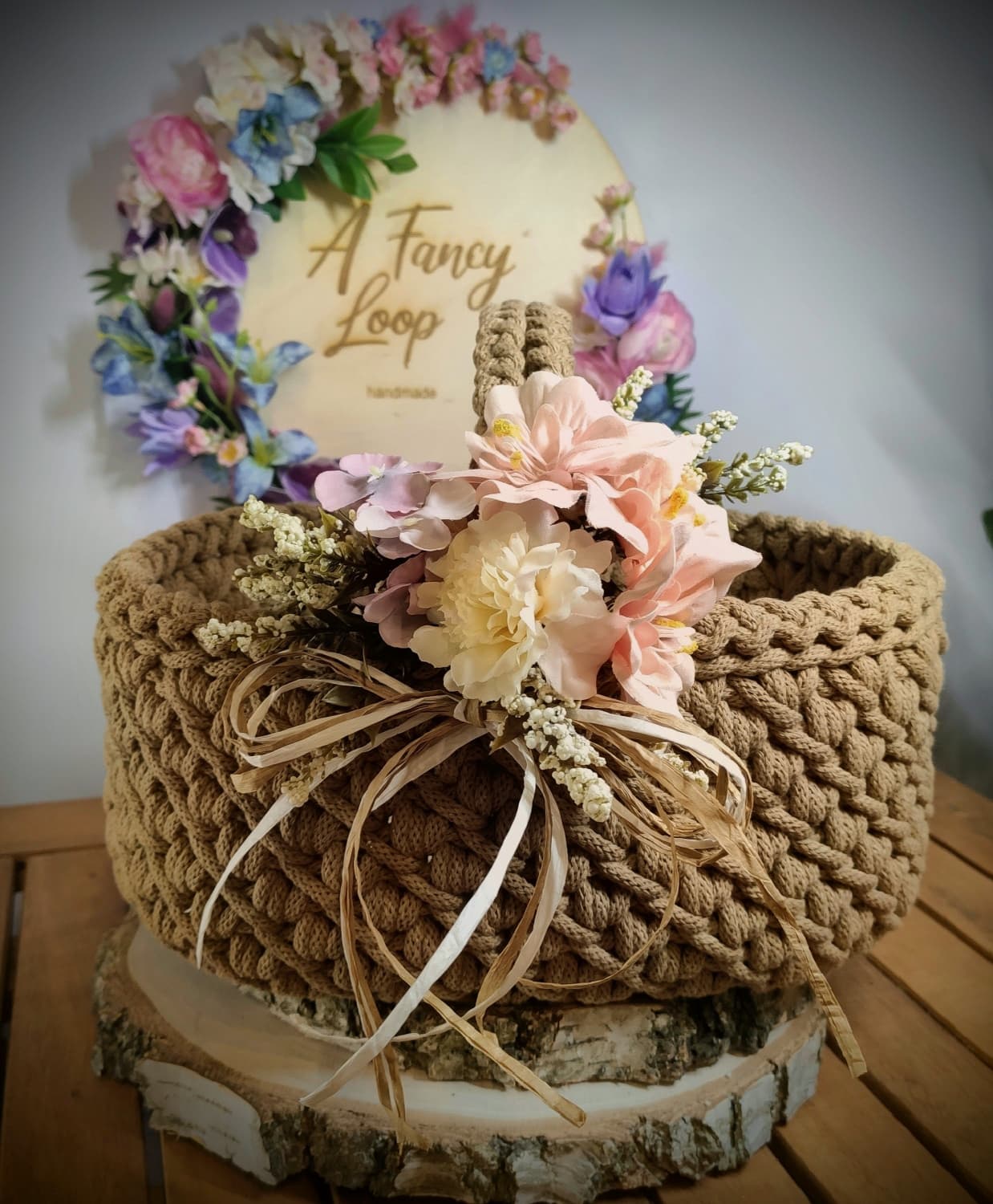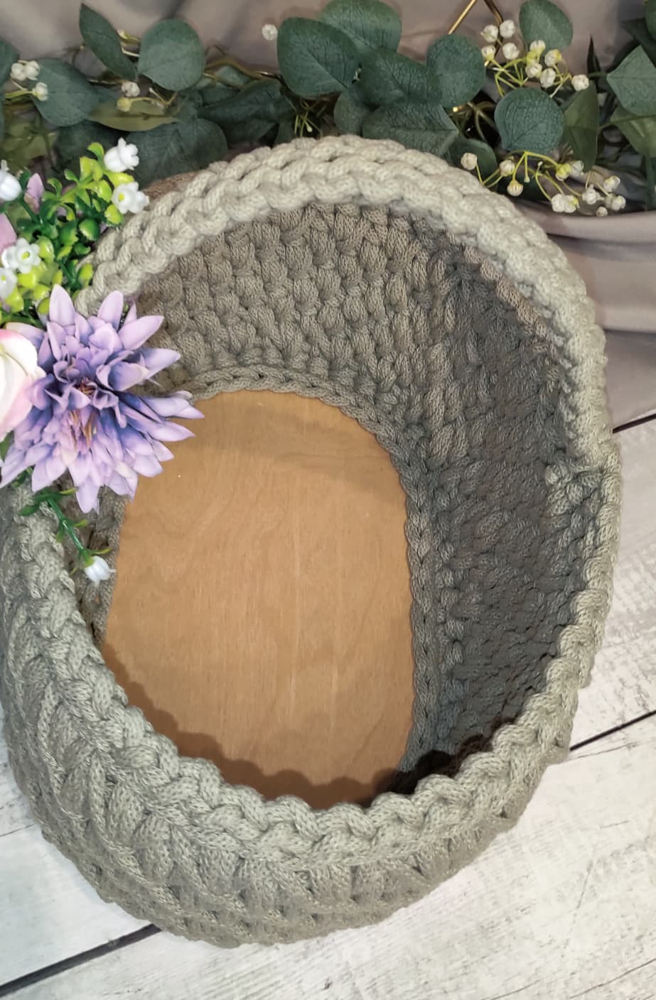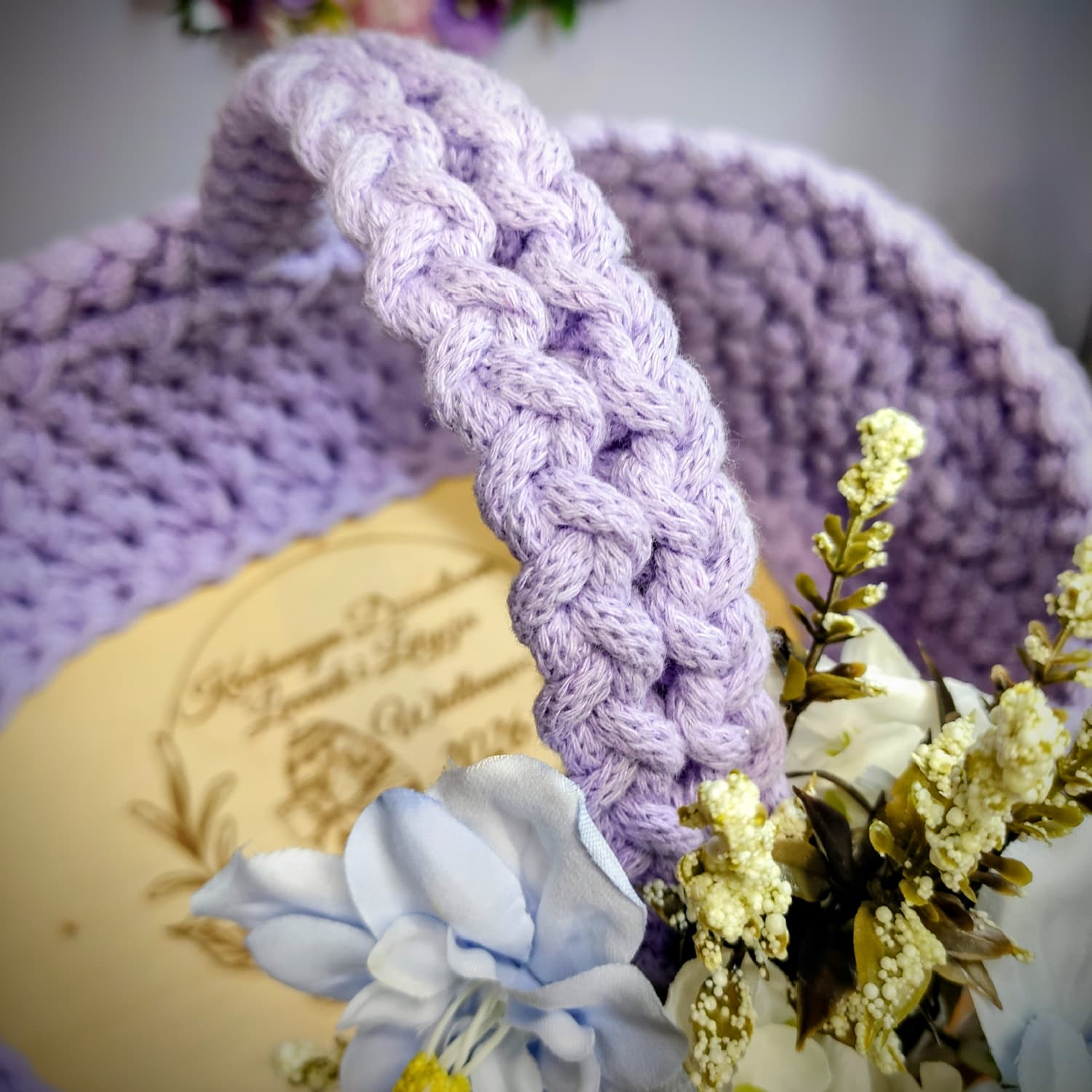 Koszyczek zdobi dekoracyjna kompozycja kwiatowa dopasowana kolorystycznie do wybranego odcienia sznurka, co tworzy spójny i estetyczny zestaw wielkanocny.
