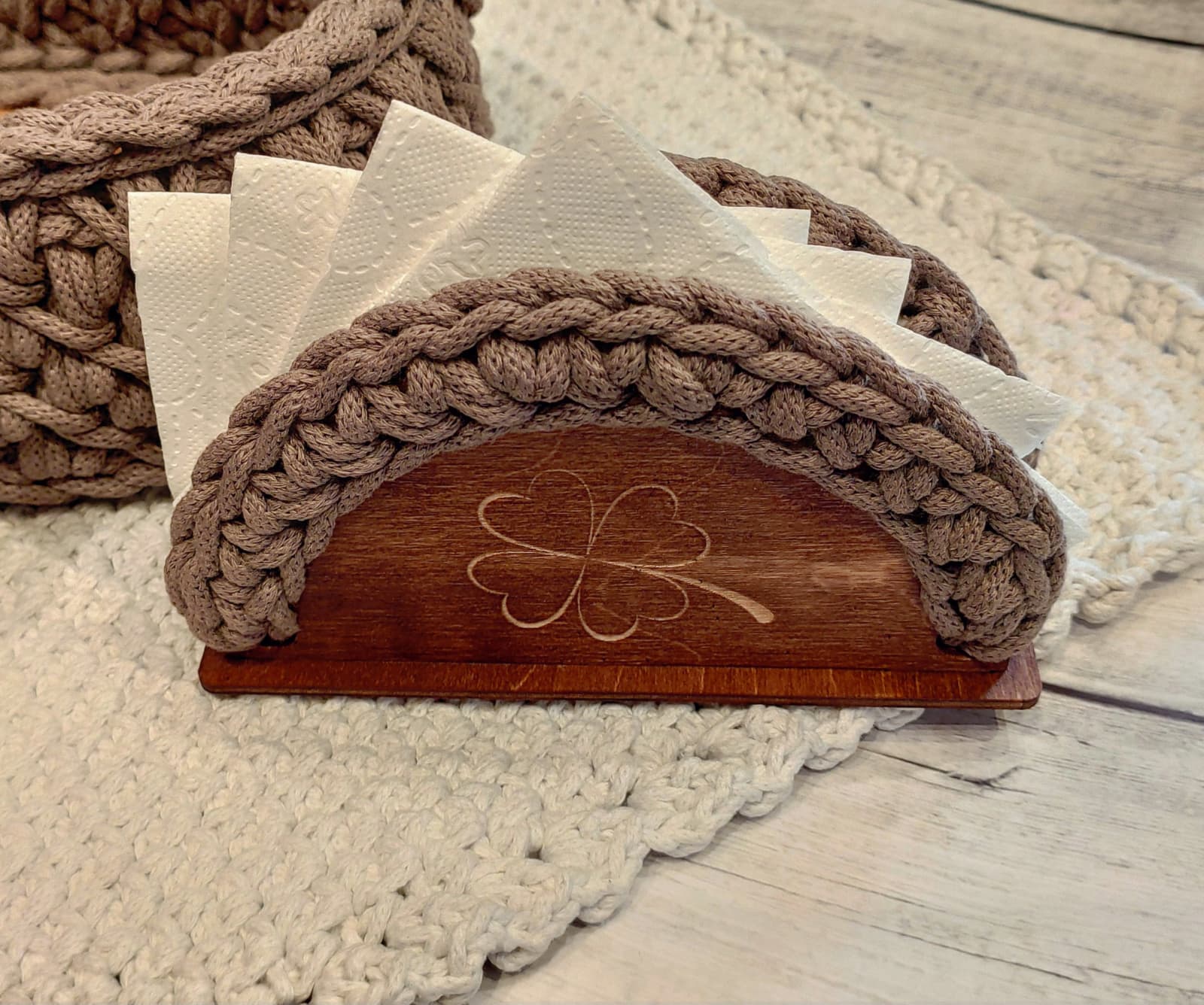 Ręcznie wykonany serwetnik ze sznurka bawełnianego to stylowy i praktyczny dodatek do kuchni oraz jadalni. Powstaje techniką szydełkową na solidnej bazie ze sklejki, dzięki czemu jest stabilny, trwały i estetyczny. Naturalny charakter produktu sprawia, że doskonale wpisuje się w wnętrza w stylu boho, skandynawskim i klasycznym.