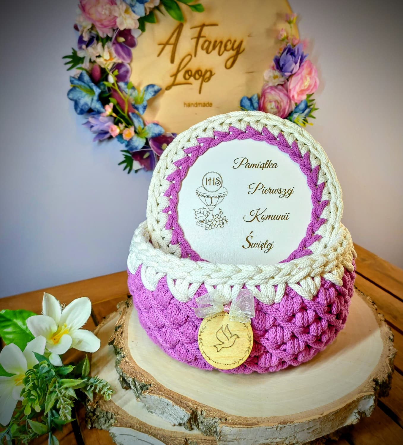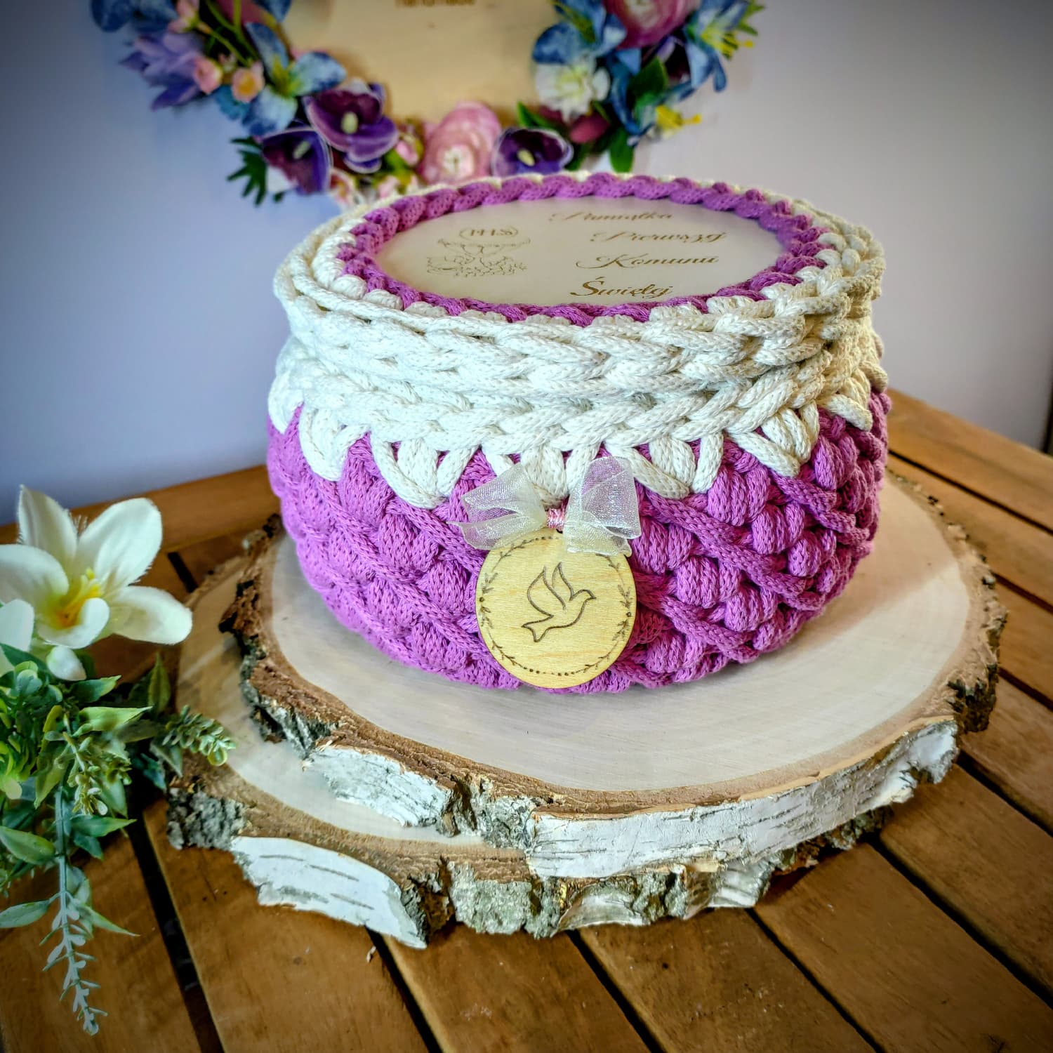 Szkatułka została wykonana techniką szydełkową z wysokiej jakości sznurka bawełnianego w połączeniu delikatnego ecru oraz romantycznego odcienia cyklamenu. Dzięki temu jest nie tylko trwała, ale także przyciąga wzrok i wyróżnia się swoim unikatowym charakterem.