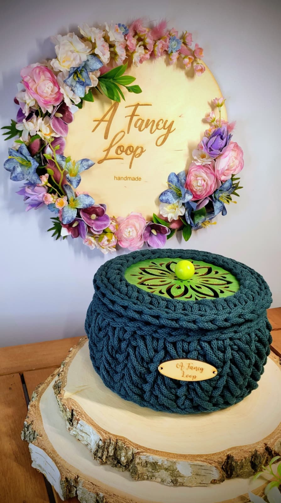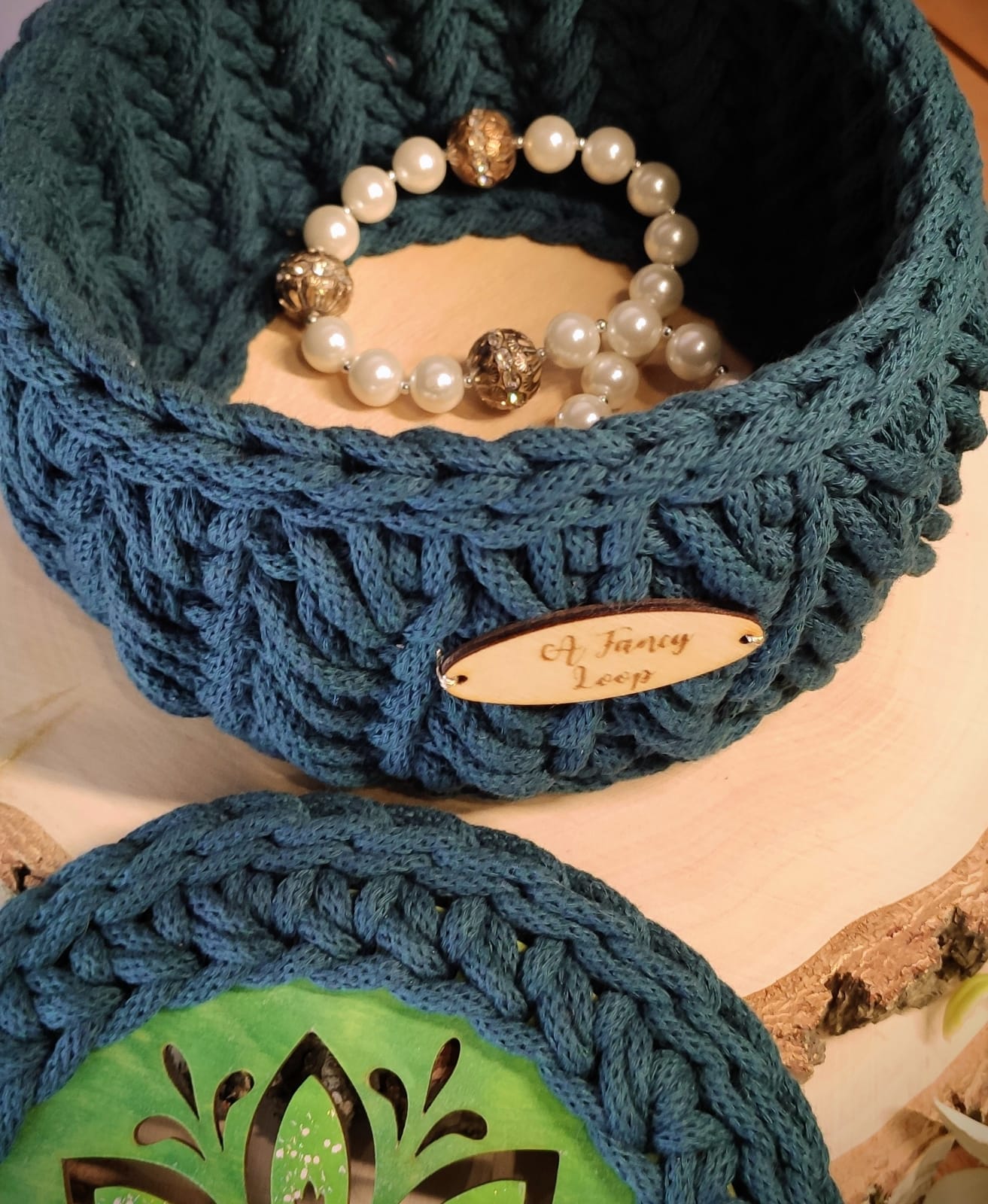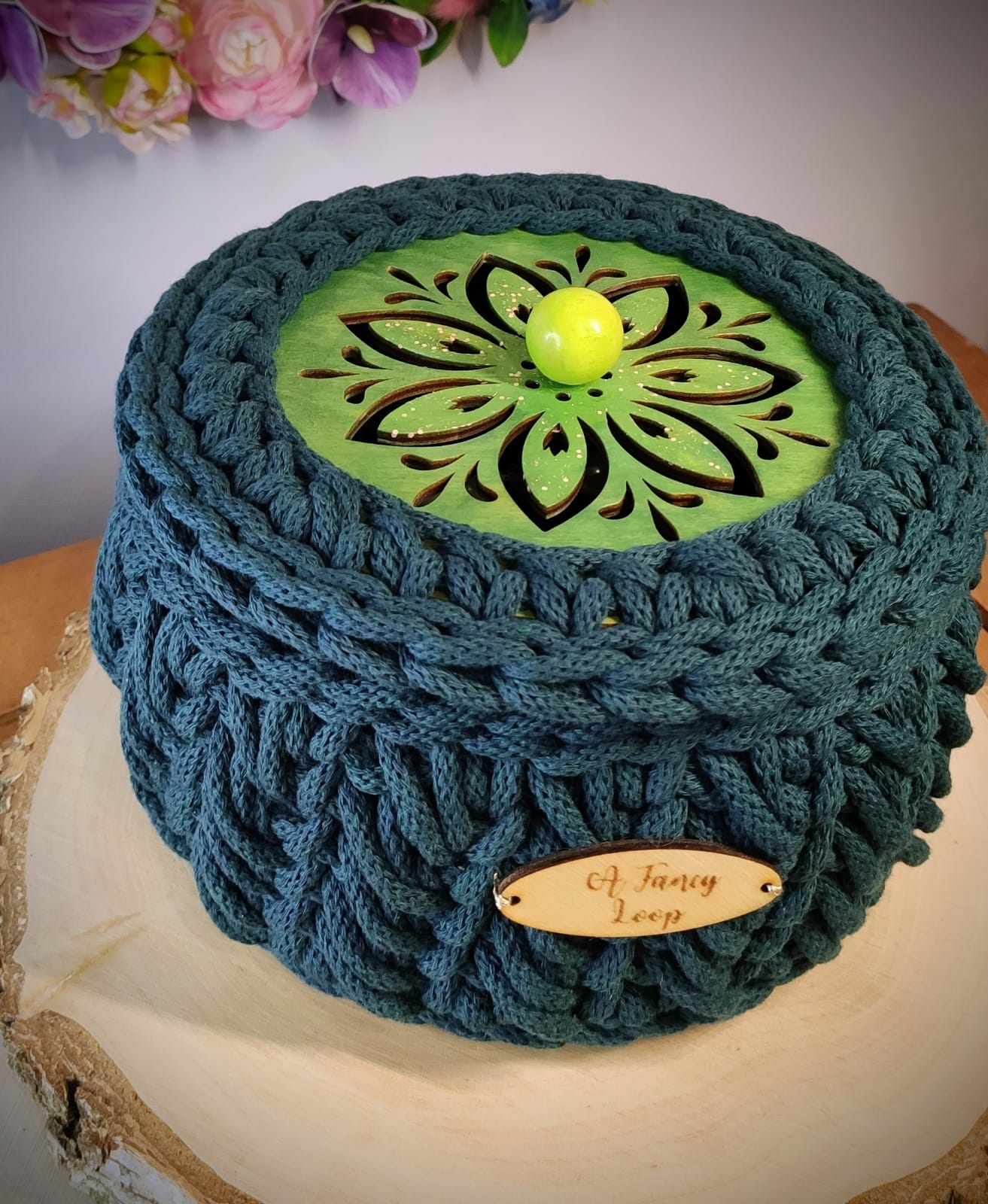 Materiał: sznurek bawełniany + drewniane wieczko
